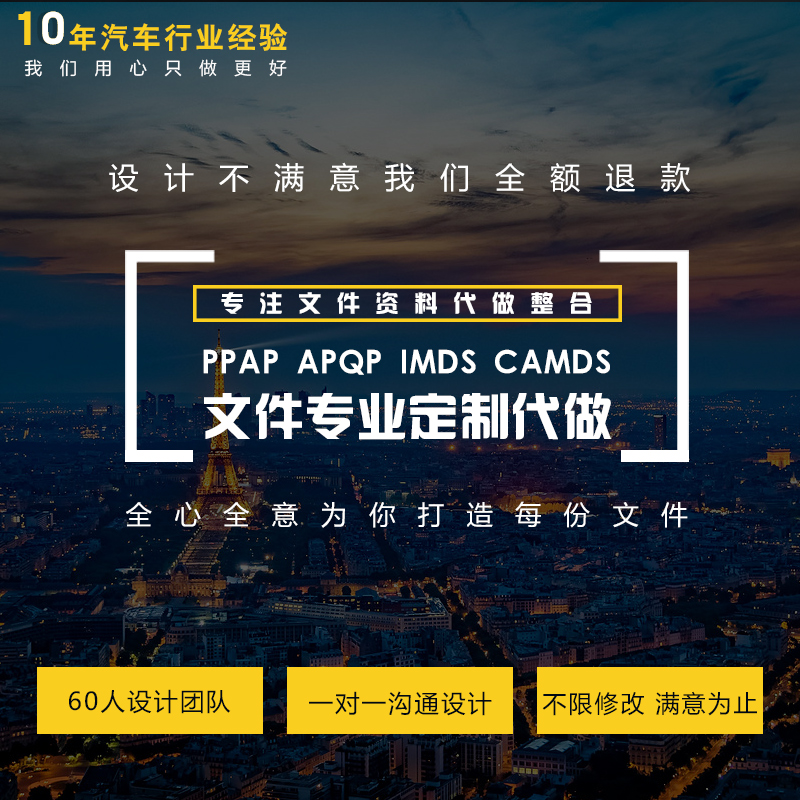 專精于五金件、注塑件、緊固件,特殊加工零件,汽車零部件等產(chǎn)品的PPAP、IMDS、CAMDS、FMEA、8D報告等技術(shù)文件輔導制作服務。